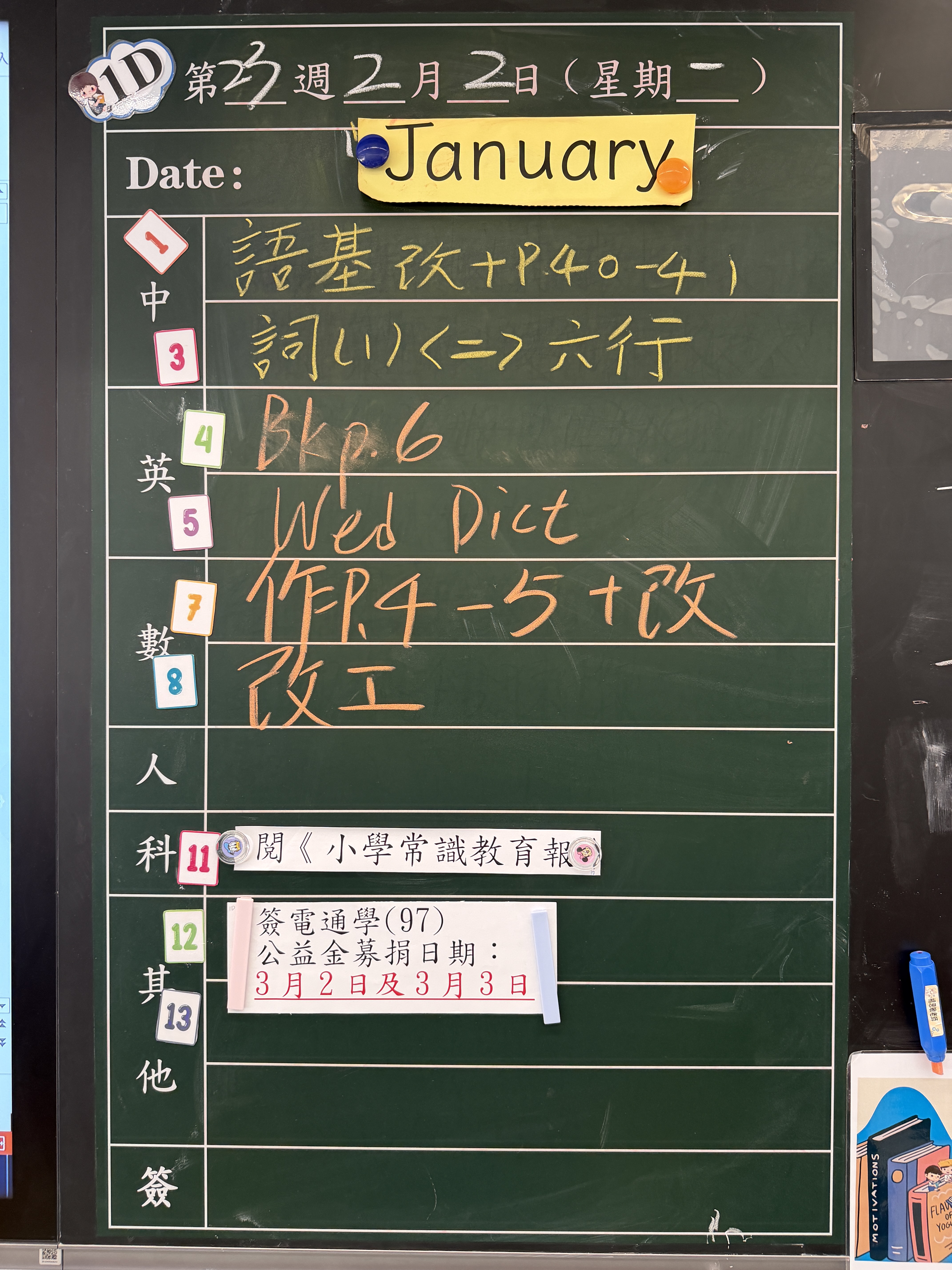 | 1D | 星期一 | 星期二 | 星期三 | 星期四 | 星期五 |