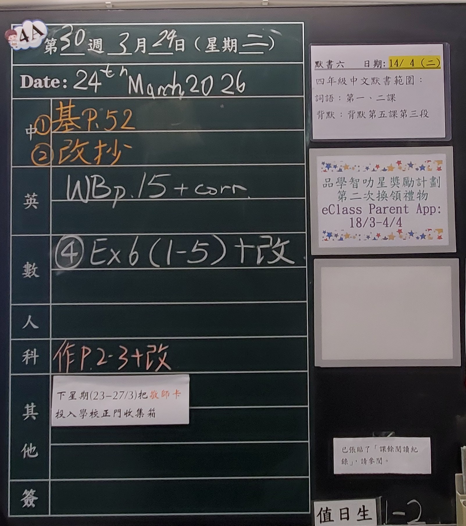 | 4A | 星期一 | 星期二 | 星期三 | 星期四 | 星期五 |