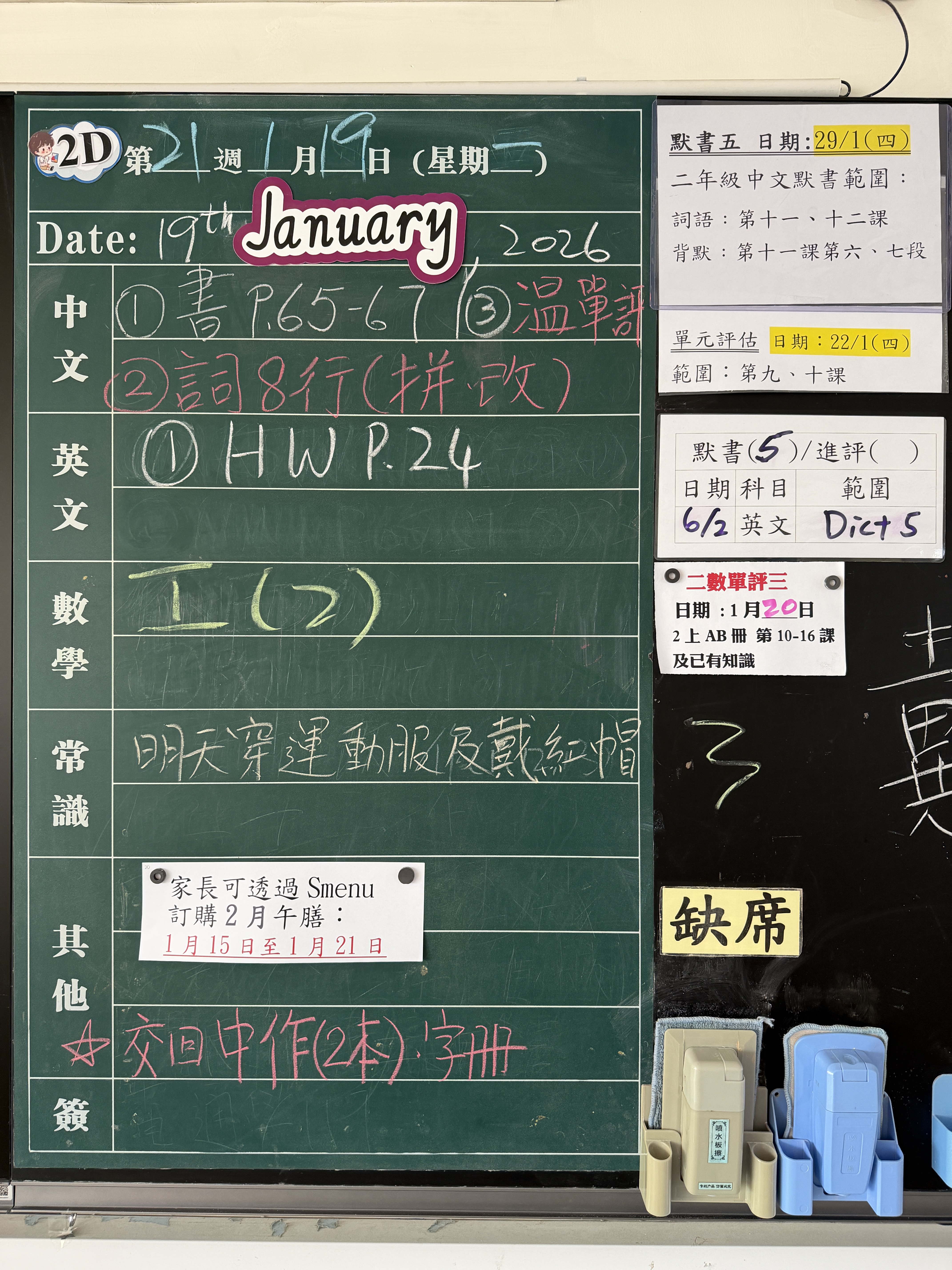 | 1D | 星期一 | 星期二 | 星期三 | 星期四 | 星期五 |